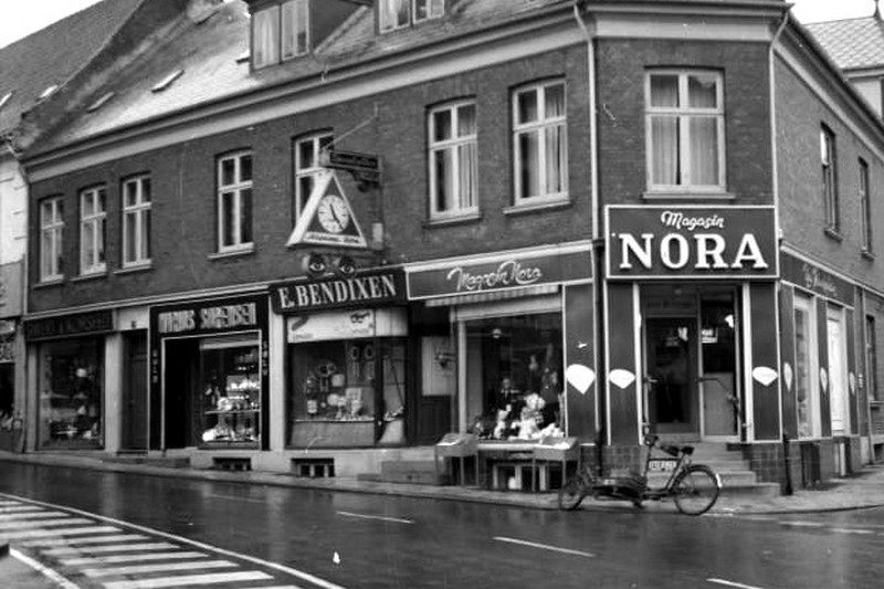 Ejendommen anno 1950, hvor der i dag er forretningerne Bendixen guldsmed og urmager og Profil Optik.